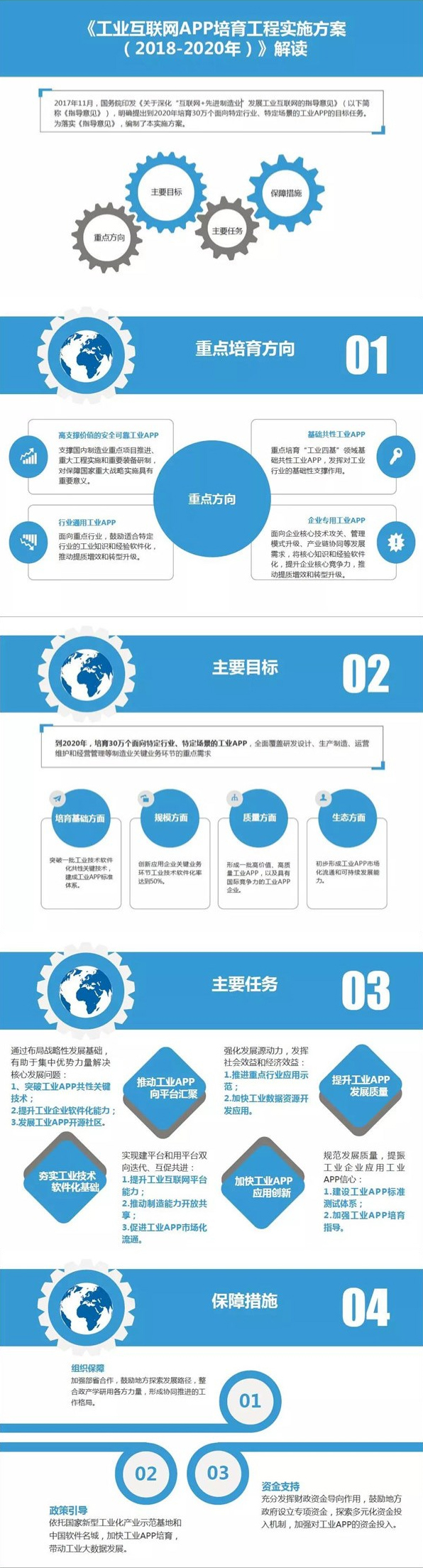 《实施方案》提出了3个方面的保障措施。一是组织保障,加强部省合作,鼓励地方探索发展路径,整合政产学研用各方力量,形成协同推进的工作格局。二是政策引导,依托国家新型工业化产业示范基地和中国软件名城,加快工业APP培育,带动工业大数据发展。三是资金支持,主要是充分发挥财政资金导向作用,鼓励地方政府设立专项资金,探索多元化资金投入机制,加强对工业APP的资金投入。