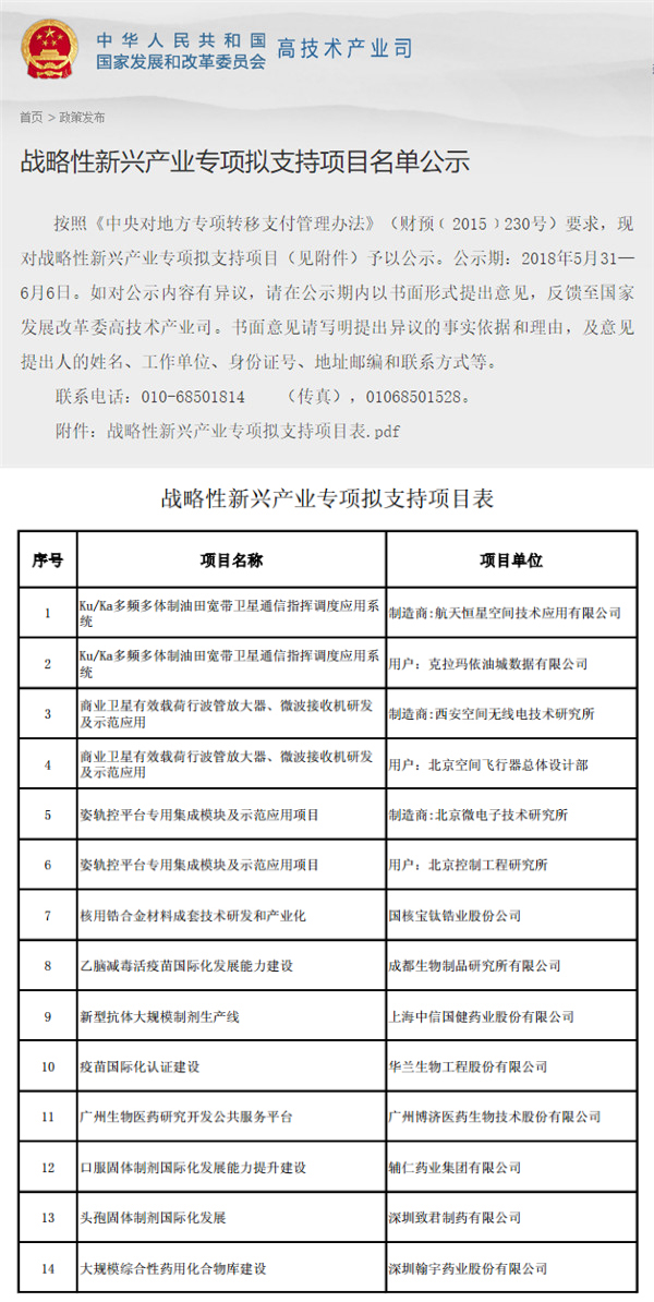 5月31日从国家发改委网站获悉,发改委公示战略性新兴产业专项拟支持项目名单,航天恒星空间技术应用技术有限公司、西安空间无线电技术研究所 、北京微电子技术研究所、国核宝钛锆业股份公司等多家公司相关项目在列。