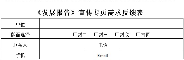 今年的《年度发展报告》编制工作已启动。根据行业内部分企业的要求和建议,协会拟在今年《年度发展报告》的编印发行中为会员单位提供企业宣传专页,并酌收一定的工本费用。需要的企业请及时与《发展报告》编委会联系,相关要求和事项通知如下: