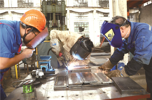 该公司特聘劳动与社会保障部全国高技能人才师资、国际焊接工程师沈亚仁现场教授四名受训学员,遵从ISO15614、ISO9606标准,学员经过严格认真的培训,取得金属极活性气体保护焊(MAG)和钨极惰性气体保护焊(TIG)两种焊接方法四种焊接工艺国际评定认证项目资格认证。四名受训学员经培训合格后,再由他们对全车间焊工进行培训,以取得国际焊工资质,使企业焊接水平迈上新台阶。图为受训学员正在培训现场进行单面焊双面成型技术的焊接培训。(李中宏 摄)