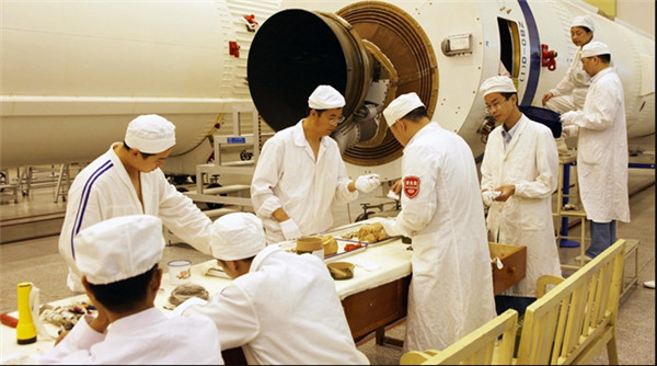 自2000年10月31日,长三甲系列运载火箭发射我国第一颗北斗卫星算起,至今共进行了28次发射,将35颗北斗卫星成功护送升空,发射成功率百分之百(其中包括7次一箭双星发射)。“高轨道”“高密度”“高可靠”,“金牌火箭”这些耀眼成绩背后,有一支优秀的运载火箭研发团队,他们是默默无闻铸造大国利器的“金牌火箭人”。新华社发(航天科技集团第一研究院 供图)在西昌卫星发射中心总装车间,科研人员正在交接产品(2009年8月9日摄)。