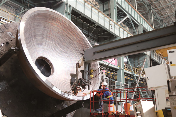 近日,广东省茂名石化项目热高压分离器设备的筒体堆焊和组焊工序在二重装备核电容器厂全面铺开,该项目共计3台热高压分离器设备,设备总重量达1800吨,均为锻焊结构,二重装备职工攻坚克难,勇于创新,确保了该石化重大技术装备的顺利在制和出产。图为二重装备核电容器厂职工组焊茂名项目的生产场景。 (张晓健 摄)