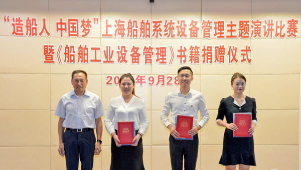 捐赠仪式后,上海船舶系统“造船人.中国梦”设备管理主题演讲决赛开赛。高水平的演讲处处透露出各单位爱设备、管设备、重技术、重管理的创新风貌。经过激烈的角逐,评委评出一等奖1名,二等奖3名,三等奖5名。中船上海船舶工业公司党委书记高烽、上海设备管理协会会长吕亚臣、上海市设备管理协会船舶工作委员会会长徐平分别为获奖者颁奖。