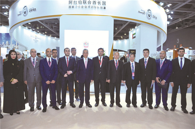 10月10日上午,参观第十五届中国国际中小企业博览会的领导、嘉宾在阿拉伯联合酋长国展台前合影。(王戈 摄)