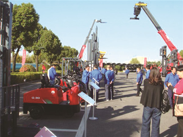 安徽叉车集团大力发展高端装备,在10月28日厂庆60周年展示会上,大型正面吊、伸缩臂叉车尤其受到人们关注。(中国工业报记者 徐斌 摄)