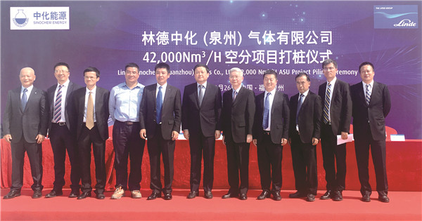 近日林德中化(泉州)气体有限公司举行了42000标准立方米/小时空分项目打桩仪式。林德中化(泉州)气体有限公司为全球领先的工业气体和工程公司之一林德集团与中国四大国家石油公司之一中化集团有限公司(以下简称“中化集团”)共同出资成立的合资公司。该仪式的举办意味着双方战略合作项目的正式开工建设,也标志着双方的合作进入实质阶段。福建省泉州市副市长吕刚,中化集团党组成员、副总裁、中化能源股份有限公司总裁江正洪和林德集团东亚区总裁方世文参加了项目打桩仪式。