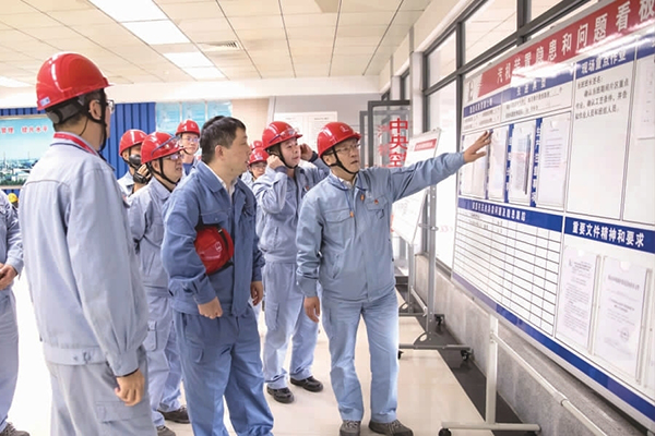 中国石化扬子公司在基层车间班组中推行安全看板管理,把日常工作中的好经验好做法、现场作业进展、装置隐患跟踪、安全管理要求、危险源风险提示等内容制作成看板悬挂在车间班组,让作业人员熟悉岗位安全要求,跟踪作业进程,督促隐患整改,对现场作业做到一目了然、全程控制,警示安全,提高了作业人员的安全意识。图为有关人员现场查验基层车间安全看板管理。(李树鹏 摄)