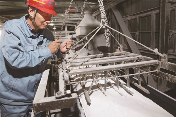 江苏连云港碱业有限公司为全面清除因设备检修遗留在生产线上的铁质杂物,确保产品质量100%合格,该公司在成品皮带和包装机出料口分别安装了11块磁铁、4套磁棒和两套管道式除铁器,采取立体吸附方式去除金属杂物效果显著,满足了国内外高端客户对纯碱产品的质量要求。图为成品车间技术人员在调整埋藏式除铁器磁棒。(朱华南 摄)