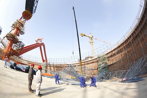 进入11月下旬以来,中安煤化工项目首座储煤仓穹顶钢网架安装拉开了序幕。中安项目建有3个圆形储煤仓,单个直径100米,储煤10万吨左右。目前开始穹顶钢网架安装的是3号煤仓,钢网架安装在17米高的环形混凝土挡墙之上,采用螺栓球点连接轻钢形式,穹顶的钢网架总重约300吨左右。其它两座煤仓的穹顶钢网架安装工作也在紧张的材料准备之中,不日将开始正式安装。(赵天奇 摄)