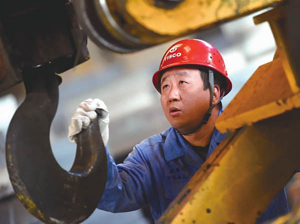 入冬以来,太钢进一步强化安全管理工作,从各岗位、各工序入手,加强安全辨识,及时处理安全隐患,确保安全生产。图为11月28日,太钢不锈热轧厂职工在检查吊具安全使用情况。(王旭宏 摄)