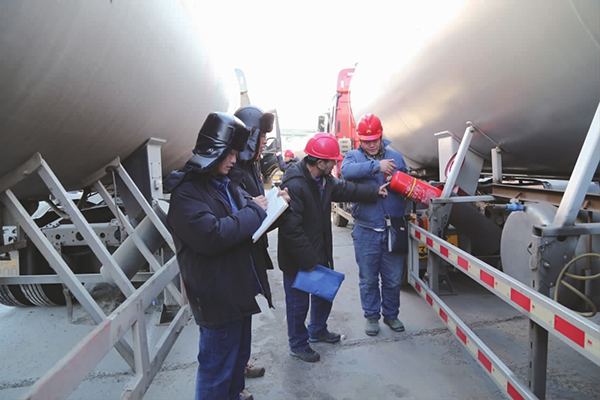 进入12月,吉林地区气温骤降,极寒天气以及冰雪路面给交通安全带来极大的隐患。吉林石化物流公司强化危险化学品运输车辆的源头管理和动态监管,深入开展危险化学品车辆专项整治行动,对100多辆运输车辆采取监控平台专人管理,现场流动检查相结合的方式,加大人员及车辆检查力度,管理人员每天对现场危险化学品车辆装卸站点车辆资质、人员证件、车辆车况、消防器材等情况进行检查,提醒驾驶员、押运员严格按照危险化学品运输车辆操作规程作业,杜绝危化品运输安全隐患。图为安全管理人员对危化品运输车辆进行专项检查。(张晓君 矫婷婷 摄影报道)