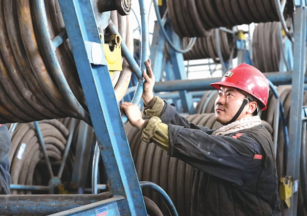 面对2019年经营管理工作,淮北矿业深挖内潜,通过开展自制加工、修旧利废等活动,挖坚持走内涵式潜、节支降耗之路,减少材料费支出,降低生产成本。图为淮北矿业童亭矿机电科电管队一名职工在悬挂维修好的电缆。(高加林 摄)