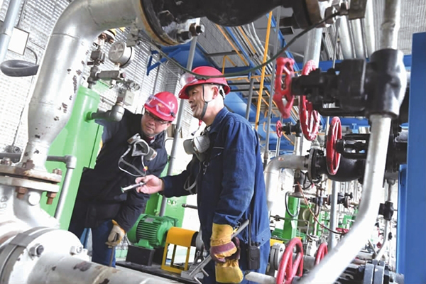 冬去春来,气温回升。为提升设备保运水平,杜绝因冷缩热胀造成装置设备管线出现跑冒滴漏现象,吉林石化染料厂坚持“六诊六勤”巡检法,严格按照规定的巡检时间、巡检路线认真执行巡检任务,坚持做到听摸查看闻测,严密监控重点设备参数,对风气水物料管路进行过筛式隐患排查,确保了装置平稳生产受控。图为该厂员工对机泵运行情况进行检查。(车玉花 摄)
