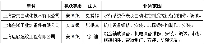 根据《上海市设备维修安装企业安全生产合格证等级评定办法》(沪设协(2018)5号),经上海市设备管理协会维修市场管理办公室评定,对上海督炜自动化技术有限公司、上海金淞工业炉备件有限公司和上海运欣建筑工程有限公司拟核发《上海市设备维修安装市场安全生产合格证》,为保证评定工作的公正性,增加工作的透明度,现将该企业拟获合格证的等级和业务开展范围等予以公示,以广泛接受社会监督。公示时间为:2018年08月23日至29日,如有不同意见,请在公示期间以书面形式将反映的情况寄(送)至上海市设备管理协会(邮寄的材料以到达日邮戳为准)。单位反映情况需加盖公章,个人反映情况需签署真实姓名,并留下真实的联系电话、地址和邮政编码。