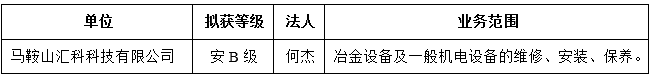 根据《上海市设备维修安装企业安全生产合格证等级评定办法》(沪设协(2018)5号),经上海市设备管理协会维修市场管理办公室评定,对马鞍山汇科科技有限公司拟核发《上海市设备维修安装市场安全生产合格证》,为保证评定工作的公正性,增加工作的透明度,现将该企业拟获合格证的等级和业务开展范围等予以公示,以广泛接受社会监督。公示时间为:2025年8月27日至9月2日,如有不同意见,请在公示期间以书面形式将反映的情况寄(送)至上海市设备管理协会(邮寄的材料以到达日邮戳为准)。单位反映情况需加盖公章,个人反映情况需签署真实姓名,并留下真实的联系电话、地址和邮政编码。